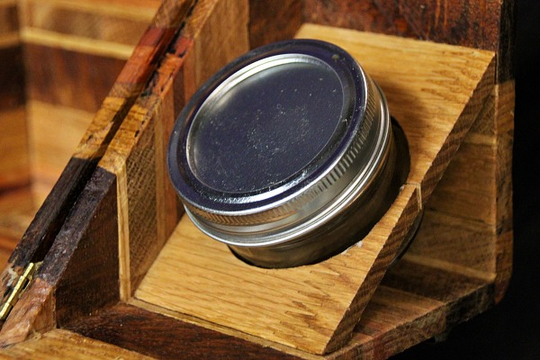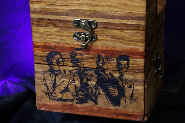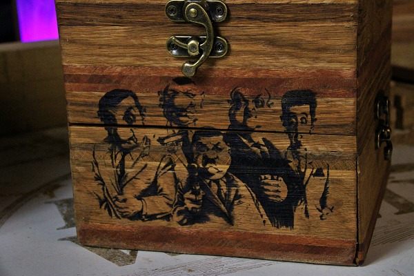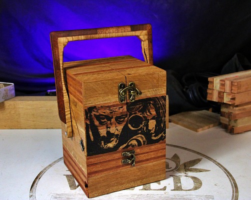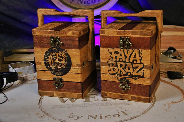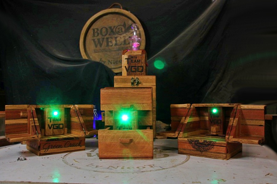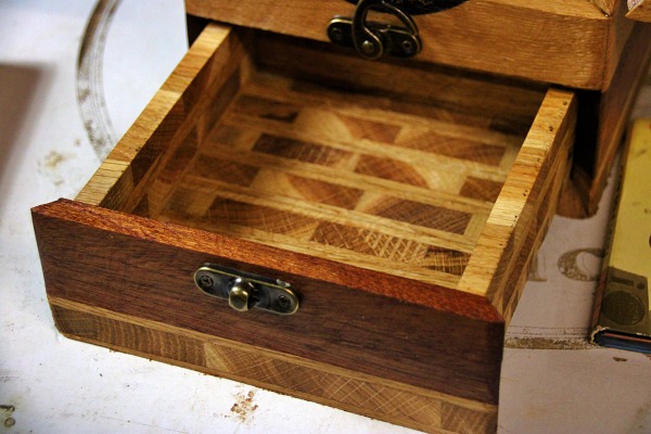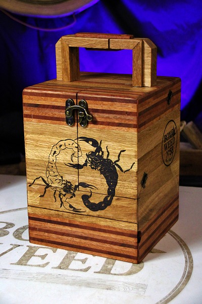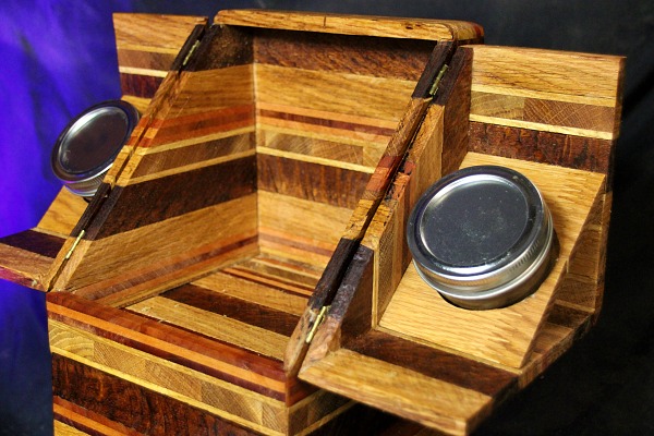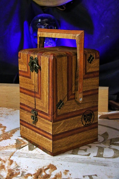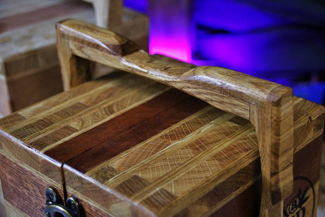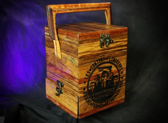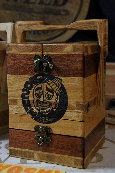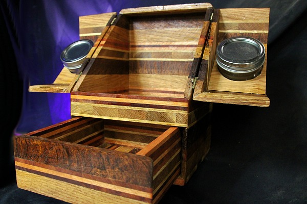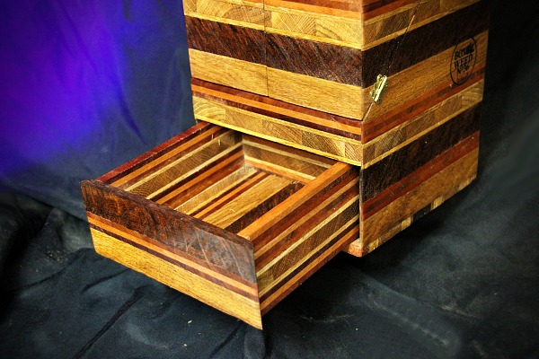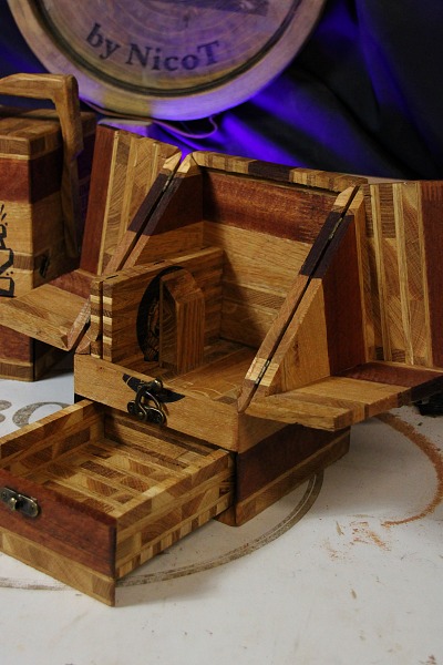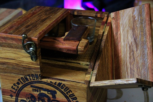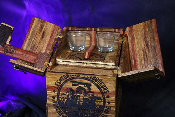 2 tiroirs au fond patchwork, 1 gun à tasser, plateau pliant, 2 petits verres à shoot, transportable facilement.
